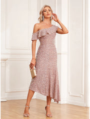 Robe à paillettes Weitese pour femme, robe de bal, robe de soirée, robe mi-longue, kaki, sans manches, unie, froncée, été, printemps, automne, épaules dénudées, élégante, soirée - US 2 / UK 6 / UE 32