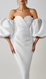 Robe de bal bustier en satin blanc à manches bouffantes