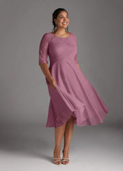 Chic A-Line Scoop Neck Three-Quarter Sleeve Back Zip Tea-Length Plus Size Mother of the Bride Dress - US 2 / UK 6 / EU 32