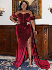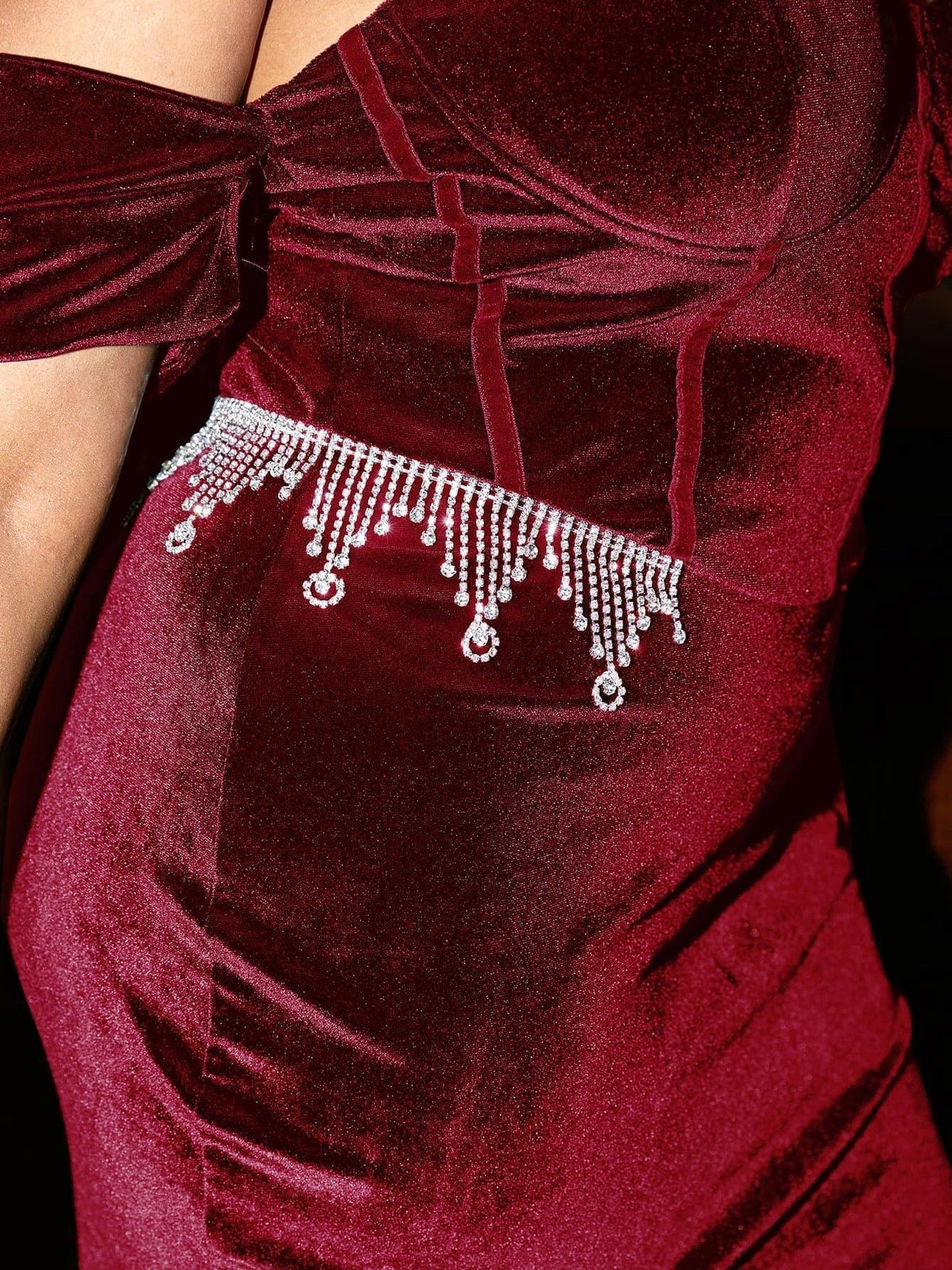 weitese's Elevate your luxurious look with this burgundy plus size off-shoulder velvet maxi dress. It features plush velvet fabric for opulent allure, an off-shoulder neckline with crystal fringe detailing for refined charm, and a high slit with a dramatic train for sophisticated flair. The rich burgundy hue ensures a standout finish, making it perfect for formal events, evening galas, or any occasion where you want to blend timeless elegance with sumptuous, textural design.