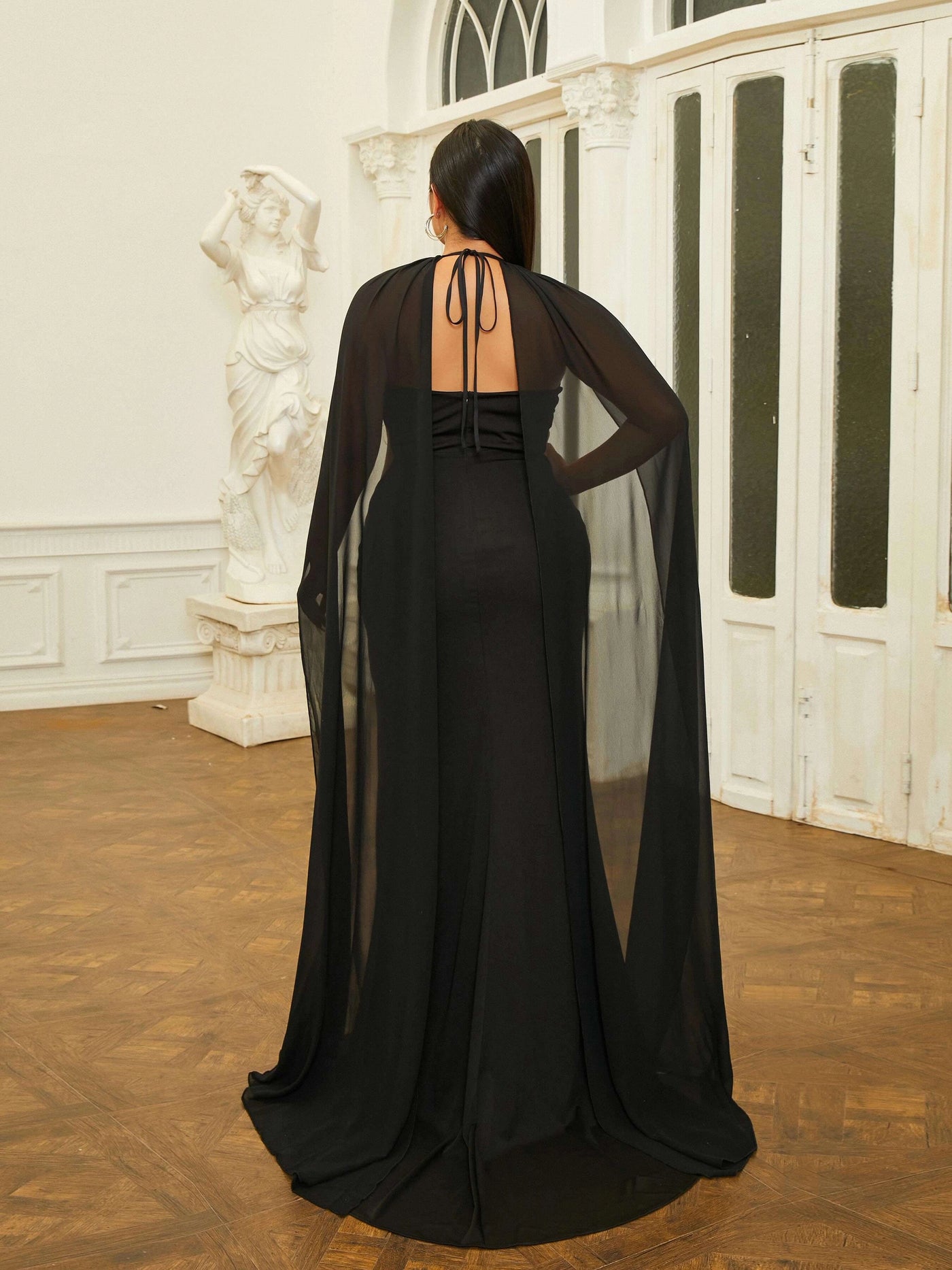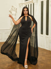 weitese's Elevate your dramatic elegance with this black plus size maxi dress. It features a sleek bodycon silhouette with sheer cape sleeves for opulent allure, a keyhole halter neckline with side cutouts for refined charm, and a high slit with a tie-back detail for sophisticated flair. The timeless black hue ensures a versatile finish, making it perfect for formal events, evening galas, or any occasion where you want to blend bold style with luxurious, textural design.