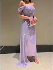 Robe de soirée élégante longueur cheville, manches courtes, épaules dénudées, satin avec paillettes froncées