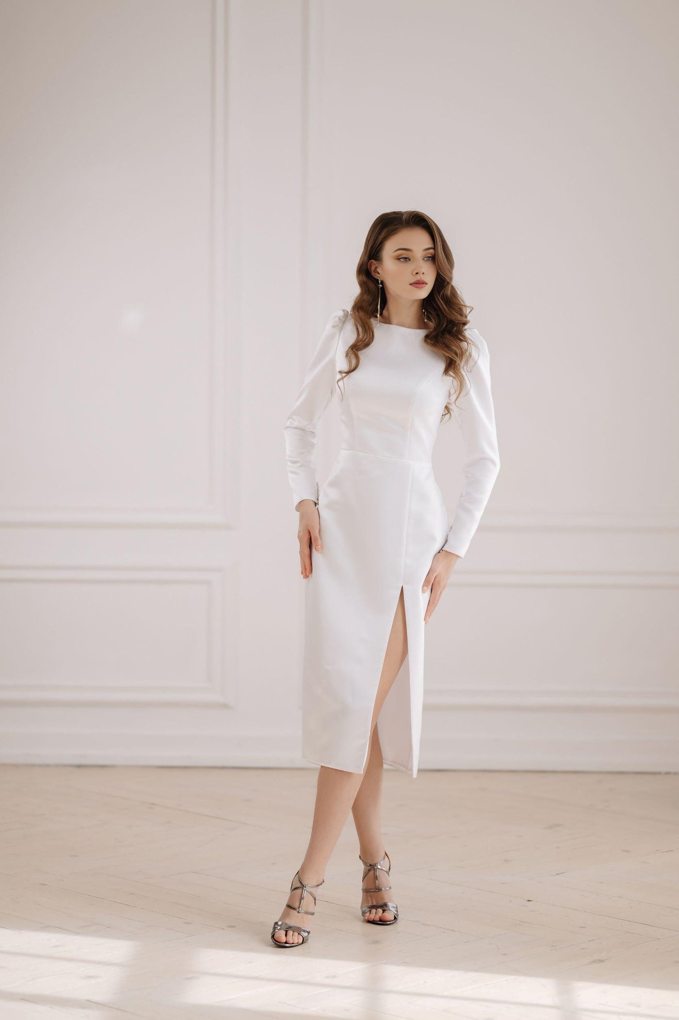 Robe de soirée sirène élégante à manches longues et col rond, en satin, longueur thé - US 2 / UK 6 / UE 32