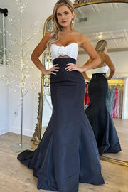 Robe de bal sirène longue en satin noir, épaules dénudées, sans bretelles, avec traîne