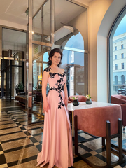 Robe de bal de fin d'année en satin rose et noir avec appliques et fente haute. Robe fluide pour invitée de mariage. Robe longue de soirée pour invitée de mariage. - US 2 / UK 6 / UE 32