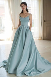 Robes de bal Magasins Chic Satin Bleu A Ligne Bretelles Spaghetti Perlée Longue Robe de Soirée Robe de Bal en Satin Bleu Robes Formelles pour Femmes