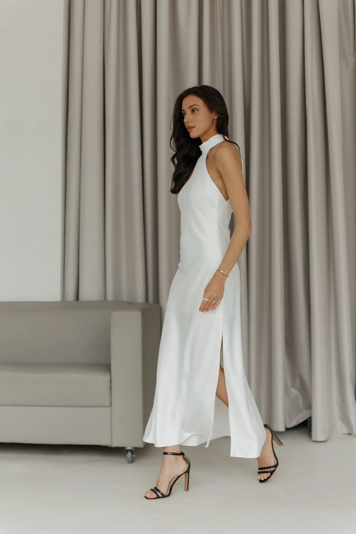 Robe de soirée sirène en satin vert sauge, sans manches, longueur cheville, à volants - Blanc / US 2 / UK 6 / UE 32