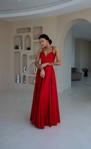 Robe de bal trapèze en satin, sans manches, à bretelles spaghetti et longueur au sol, avec fente - US 2 / UK 6 / UE 32