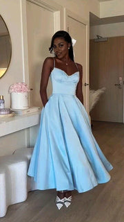 Robe de soirée simple en satin bleu, longueur thé, bretelles spaghetti - US 2 / UK 6 / UE 32