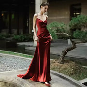 Robe de bal sirène sexy en satin bordeaux à bretelles spaghetti et dos ouvert avec traîne - US 2 / UK 6 / UE 32
