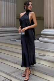 Robe longue en satin noir Weitese, dos nu, avec jupe fluide et drapé - Noir / US 2 / UK 6 / UE 32