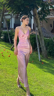 Robes de soirée Weitese Robe de bal longue en satin rose à col en V Robe d'invitée de mariage Robes de bal Boutiques Robes formelles pour femmes