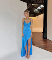 Robes de soirée Weitese pour femmes, robe de bal trapèze bleue en satin avec col en V et fente, magasins de robes de bal