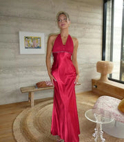Robe de soirée longue en satin rouge style sirène pour femme, col licou, style Weitese. - US 2 / UK 6 / UE 32