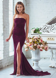 Robe longue bustier prune en velours avec traîne sirène, robe d'invitée de mariage, robe de soirée, robe de demoiselle d'honneur, robe moulante pour occasion spéciale avec fente - US 2 / UK 6 / UE 32