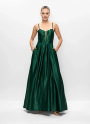 weitese's Elevate your elegant allure with this emerald green satin spaghetti strap A-line gown. It features lustrous satin fabric with a sweetheart neckline and sheer bodice detail for opulent charm, an A-line silhouette with functional pockets for refined practicality, and a sleek back zipper closure that adds a touch of polished flair. The rich emerald green hue ensures a captivating finish, making it perfect for formal events, weddings, or any occasion where you want to embrace timeless luxury with graceful, show-stopping style.