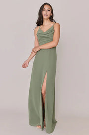 weitese's Elevate your bridal party look with this sage green bridesmaid dress. It features a cowl neck and spaghetti straps for elegant charm, a lace-up back for customizable fit, and a high slit for graceful movement. The flowing chiffon fabric ensures comfort and style, making it perfect for weddings, formal events, or any occasion where you want your bridesmaids to showcase timeless sophistication.