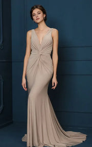 Robe de soirée longue sexy à col en V et froncée, sans manches, avec traîne - US 2 / UK 6 / UE 32