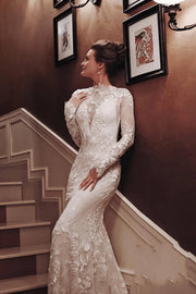 Robe de mariée blanche charmante, col haut, dos nu, style sirène, manches longues, avec appliques en dentelle - US 2 / UK 6 / UE 32