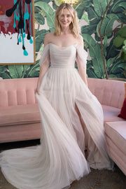Robe de mariée trapèze en tulle, sans manches, épaules dénudées, longueur au sol, avec fente - US 2 / UK 6 / UE 32