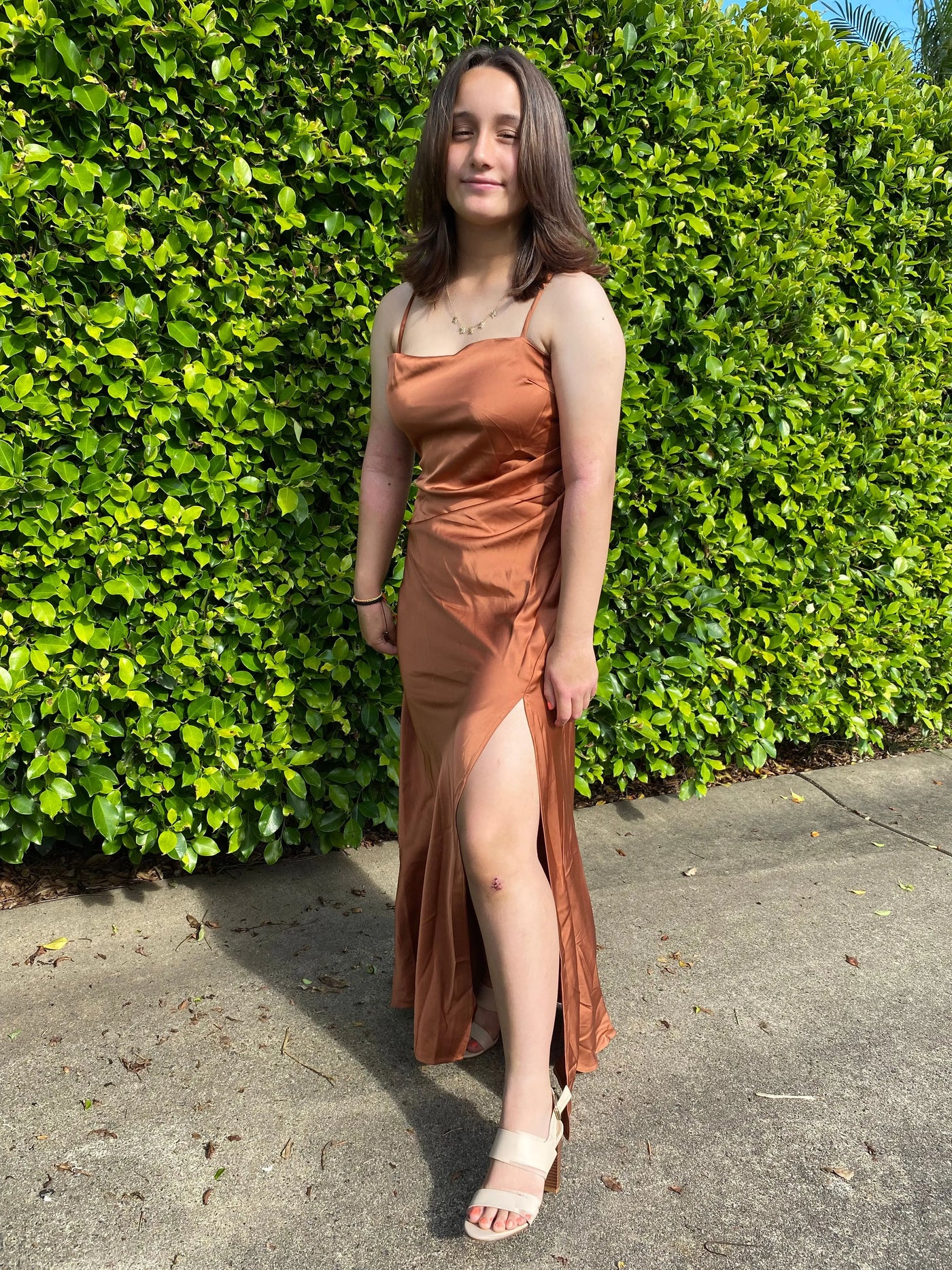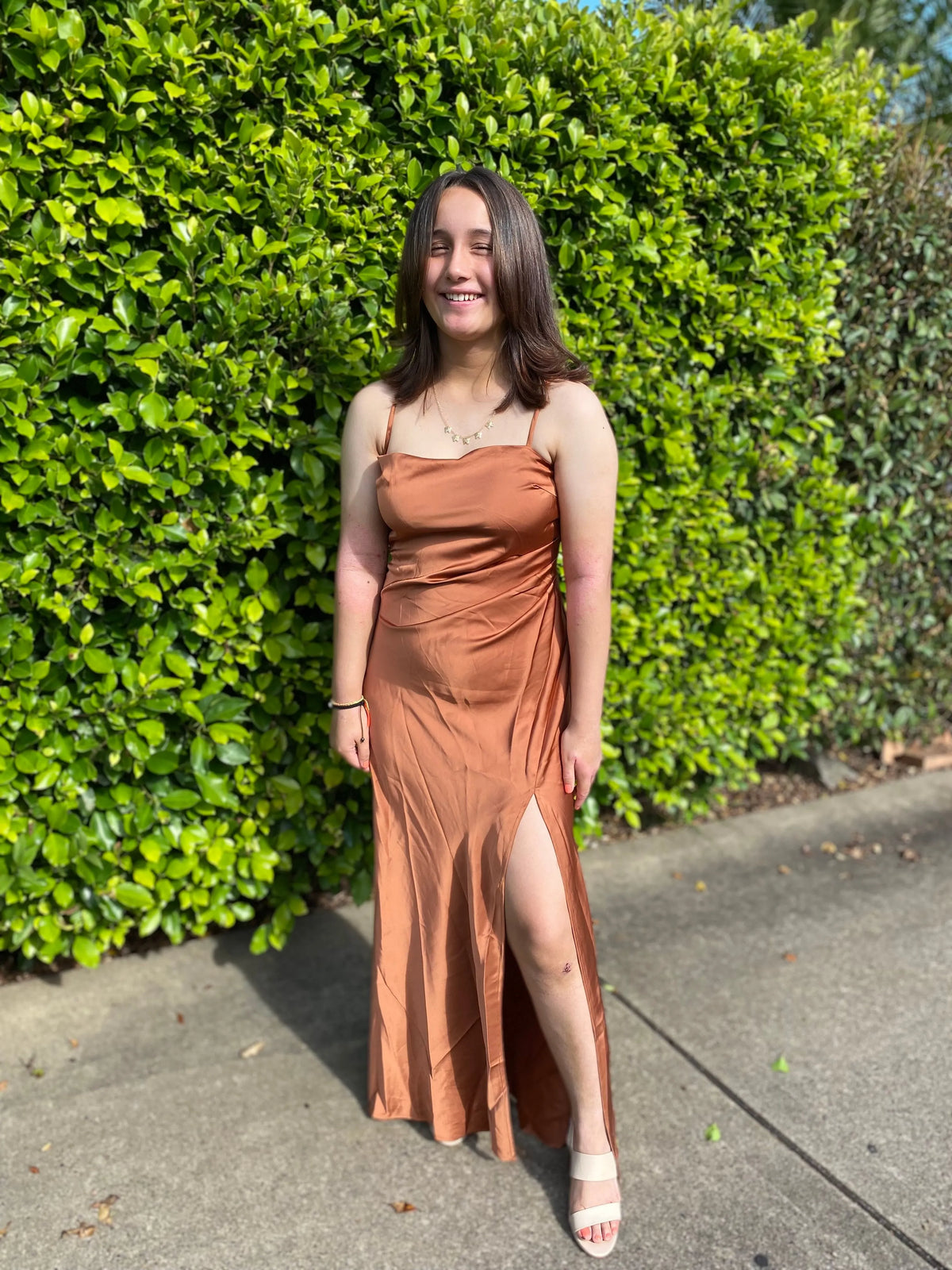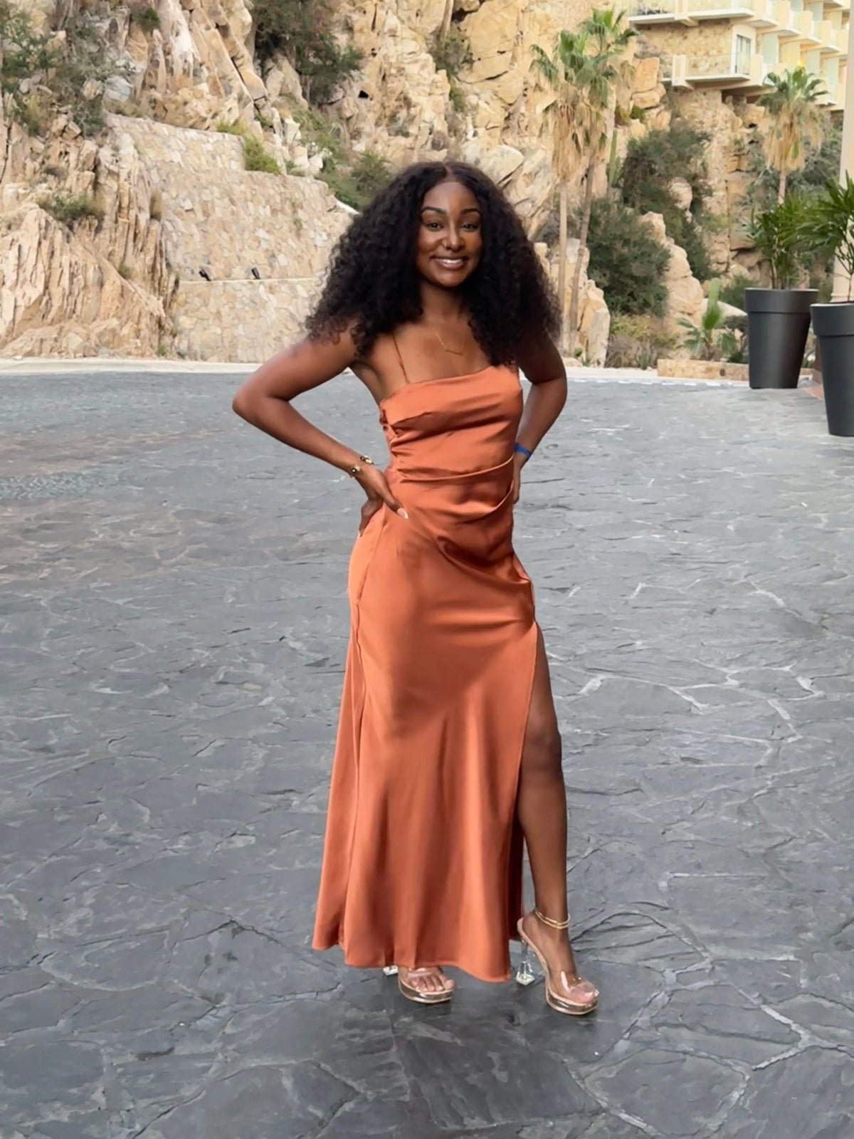 weitese's satin slip gown features a sleek square-neck bodice, adjustable spaghetti straps, a figure-hugging silhouette, and a dramatic high thigh slit. The lustrous satin texture and warm terracotta tone balance modern elegance with understated glamour, making it ideal for upscale dinner parties, date nights, or formal cocktail events—combines minimalist tailoring with polished, sophisticated allure.
