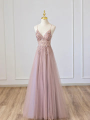 This elegant maxi gown features a delicate V-neckline with thin spaghetti straps, a sheer bodice adorned with intricate beaded floral appliqués that cinch the waist, and a flowing A-line tulle skirt with a subtle train. The open back is finished with a deep V and hidden zipper closure for a sleek, romantic finish, while the lightweight tulle fabric delivers an ethereal, dreamy drape. Ideal for proms, weddings, and formal galas, it blends soft dusty rose charm with luxurious beading for a timeless, enchanting look.