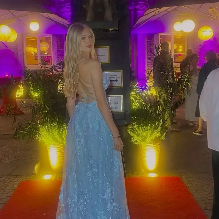 This glamorous maxi gown features delicate spaghetti straps and a deep V-neckline, with a sheer corset bodice adorned with intricate 3D floral lace appliqués and shimmering beadwork. The flowing tulle skirt includes a thigh-high slit and a subtle train, while the open back with lace-up closure ensures a customizable fit. Crafted from lightweight tulle, it delivers an ethereal, romantic drape ideal for red-carpet events, proms, and formal galas, blending soft sky-blue charm with modern allure for a showstopping look.