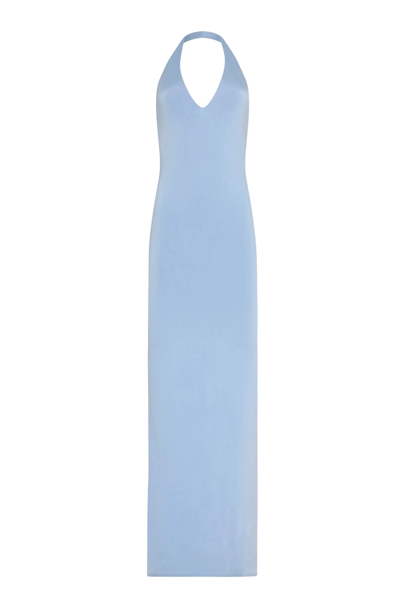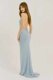 This chic mermaid evening dress features a flattering halter neckline with a deep V front that enhances the neckline elegantly. Crafted from soft lightweight stretch fabric, it hugs the body to highlight natural curves before flowing into a graceful floor-length hem. The open back with ruched detailing adds a refined yet alluring finish, perfect for galas, weddings, and formal occasions.