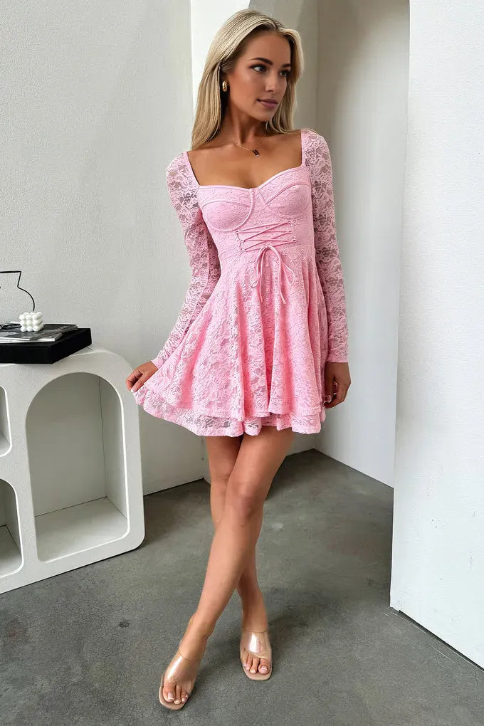 weitese's pink lace mini gown features a square neck bodice, sheer long lace sleeves, a corset-style front tie, and a flared ruffled skirt. The soft pink tone and intricate lace texture balance feminine romance with playful elegance, making it ideal for bridal showers, cocktail parties, or spring social events—combines delicate tailoring with polished, whimsical allure.