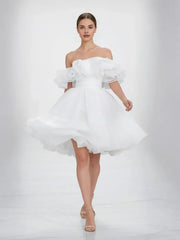 weitese's white off-the-shoulder mini gown features voluminous layered ruffle sleeves (crafted from lightweight organza), a structured corset bodice, and a flared A-line mini skirt. The airy organza texture and playful ruffle detail balance romantic whimsy with modern chic, making it ideal for bridal showers, engagement parties, or upscale cocktail events—combines bold, feminine tailoring with polished, eye-catching allure.