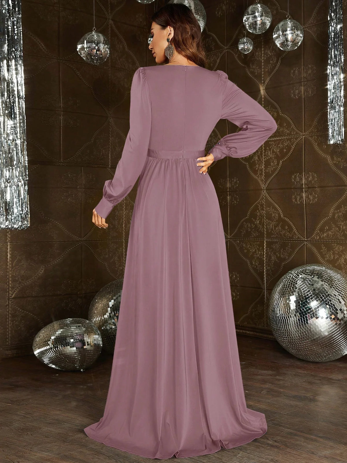weitese's Elevate your glamorous allure with this dusty lilac chiffon A-line maxi dress. It features flowing chiffon fabric with a plunging V-neck and long puff sleeves for opulent allure, a crystal-embellished waistband for refined charm, and a high slit for sophisticated flair. The soft dusty lilac hue ensures a timeless finish, making it perfect for formal events, evening galas, or any occasion where you want to blend airy elegance with sparkling, red-carpet-worthy design.
