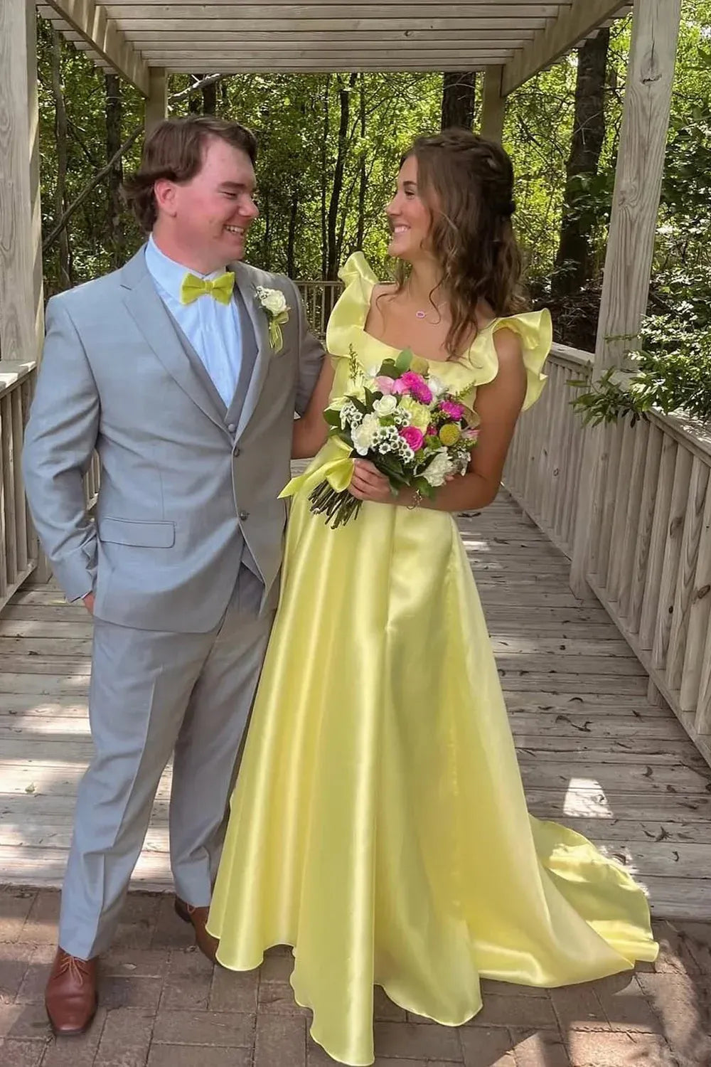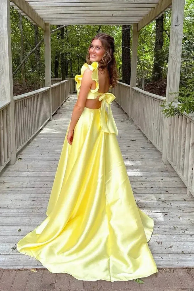 This elegant yellow gown features a flattering A-line silhouette, crafted from luxurious, lustrous satin that drapes beautifully and catches the light. The ruffle shoulder straps add a romantic, feminine touch, while the open back with a large bow detail creates a stunning, modern look. A concealed zipper at the back ensures a seamless fit, and the floor-length hem adds a touch of timeless glamour. Perfect for weddings, proms, and other formal occasions, this gown can be customized in your choice of color and size to create a truly head-turning look.