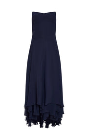 This elegant navy blue midi dress features a flattering A-line silhouette, crafted from lightweight, flowy chiffon that drapes beautifully. The strapless neckline is structured for a secure fit, while the layered ruffle high-low hem adds movement and a romantic touch. The smocked back panel ensures comfort and a perfect fit, with a concealed zipper closure. Ideal for weddings, cocktail parties, and formal events, this dress can be customized in your choice of color and size to create a truly unique look.