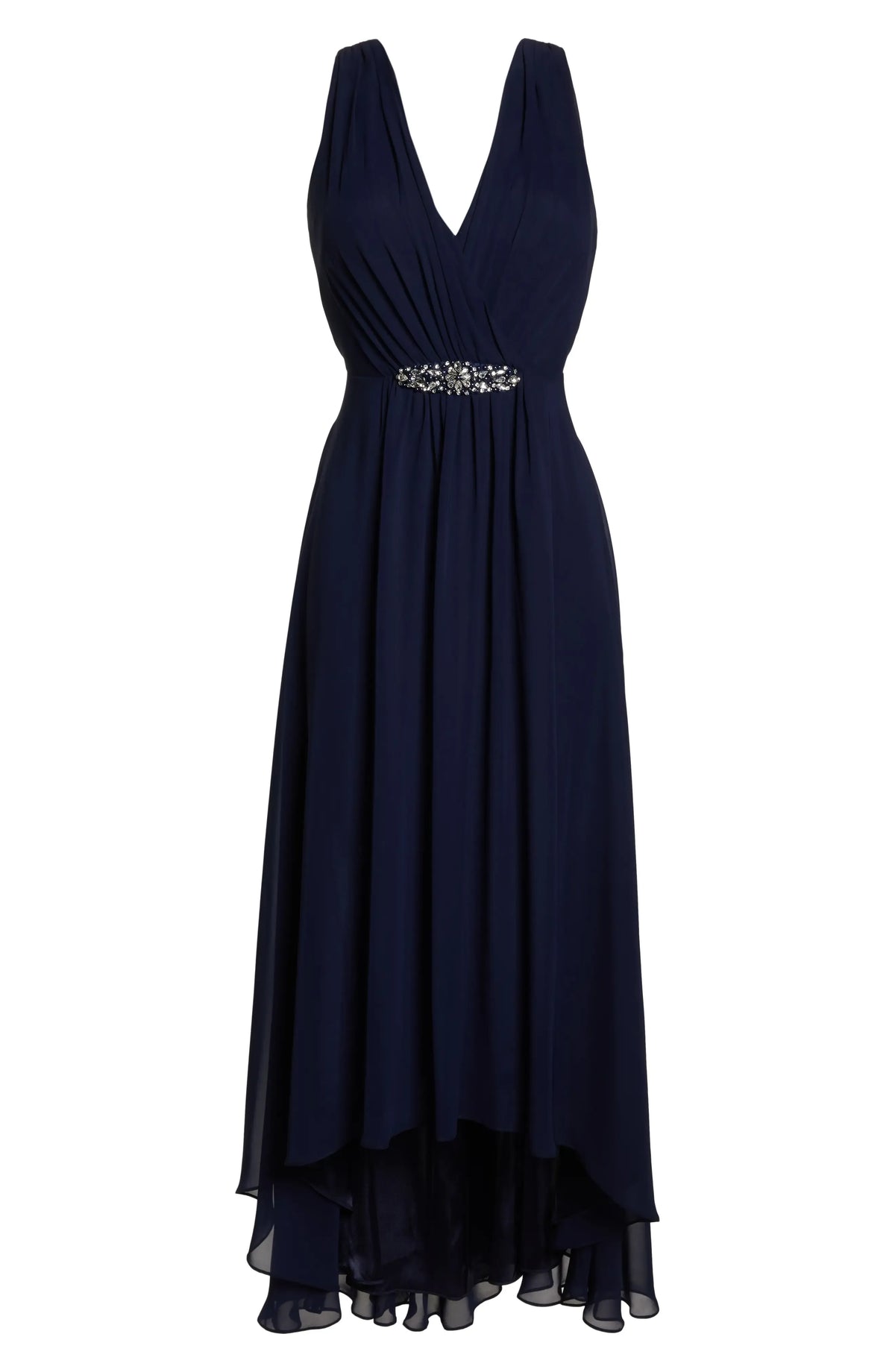 weitese's Elevate your sophisticated allure with this navy chiffon high-low gown. It features a flowing chiffon fabric with a V-neckline for opulent charm, a high-low hem and ruched bodice for refined elegance, and a rhinestone-embellished waistband that adds a touch of glamorous flair. The classic navy hue ensures a captivating finish, making it perfect for formal events, weddings, or any occasion where you want to embrace timeless luxury with polished, red-carpet-worthy style.