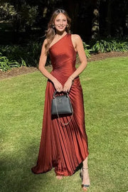 This sophisticated evening gown features a sleek one-shoulder neckline and all-over diagonal pleated detailing that beautifully sculpts the figure. Crafted from luxurious, lustrous satin fabric, it flows into an elegant floor-length A-line silhouette with a subtle asymmetric hem. The timeless warm rust brown hue exudes mature glamour, making it an ideal choice for weddings, cocktail parties, black-tie galas and upscale formal gatherings. Custom sizing is available upon request.