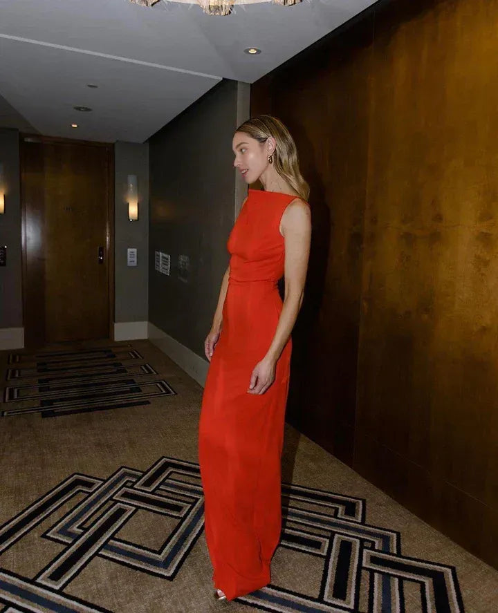 weitese's Elevate your formal style with this red asymmetric neck maxi dress. It features a chic asymmetric neckline, a tailored bodice that enhances the silhouette, an alluring open back, and a subtle back slit for movement. Crafted from smooth fabric, this dress exudes timeless elegance and is perfect for galas, weddings, or any upscale occasion. The vibrant red hue and refined design make it a standout choice, ideal for pairing with gold jewelry and strappy heels to complete a polished ensemble.