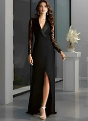 Elegant V-Neck Long Sleeves A-Line Slit Satin Sweep Train Evening Dress
