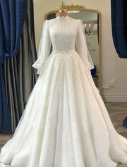 Engagement Vintage 1940s / 1950s Formal Wedding Dresses Ball Gown High Neck Long Sleeve Court Train Lace Bridal Gowns