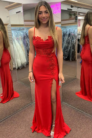 Glamorous Mermaid Spaghetti Strap Lace Applique Slit Prom Gown