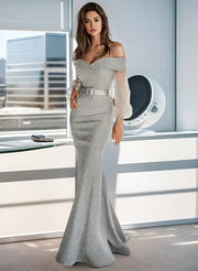 Graceful Off-The-Shoulder Mermaid Long Sleeves Pleated Sweep Train Evening Dress