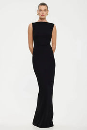 weitese's Elevate your formal style with this black boat neck maxi dress. It features a sophisticated boat neckline, a tailored bodice that enhances the silhouette, an alluring open back, and a subtle back slit for movement. Crafted from smooth fabric, this dress exudes timeless elegance and is perfect for galas, weddings, or any upscale occasion. The classic black hue and refined design make it a standout choice, ideal for pairing with gold jewelry and strappy heels to complete a polished ensemble.