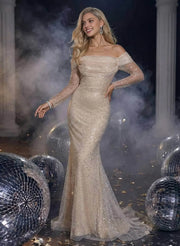Sparkle Sheath Off-The-Shoulder Long Sleeves Sequins Pleated Sweep Train Prom Dress