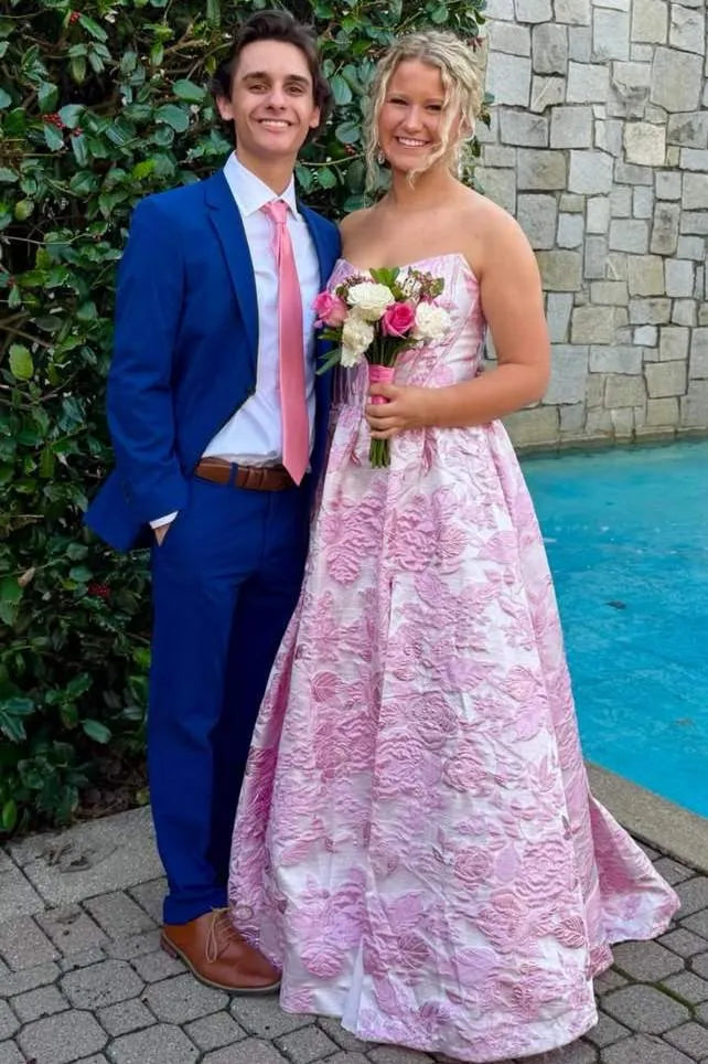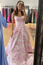 This timeless formal ball gown features a chic strapless square neckline and structured corset boned bodice for a flattering fitted silhouette. The full A-line floor-length skirt is crafted from luxurious embossed jacquard fabric, adorned with romantic raised pink floral motifs against a soft ivory base. A low open V-back completes this elegant look, making it ideal for prom, quinceañera, wedding guest, bridal ball and black-tie formal events. Custom sizing is available.