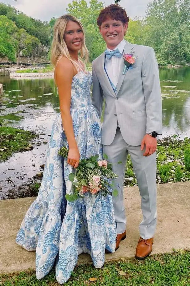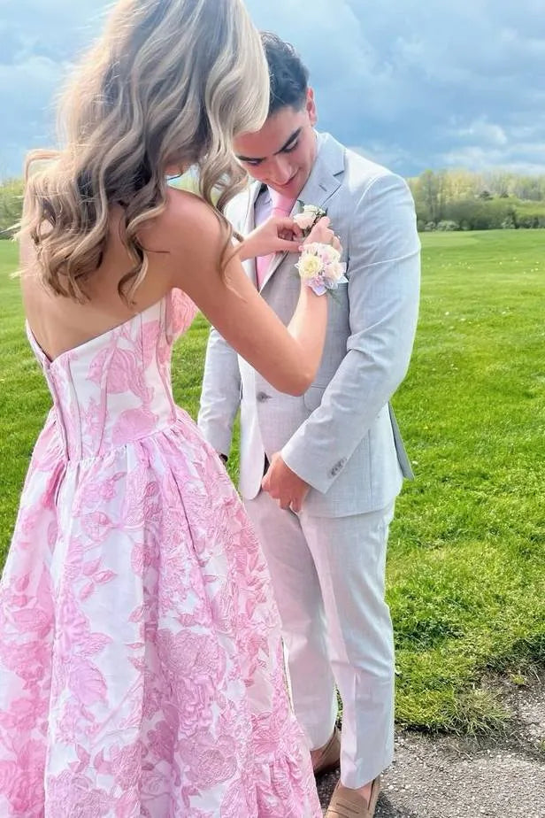 Sweetheart Strapless Corset Jacquard Floral A-Line Prom Ball Gown - Pink / US 2 / UK 6 / EU 32
