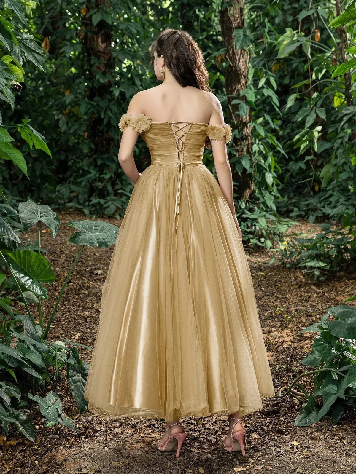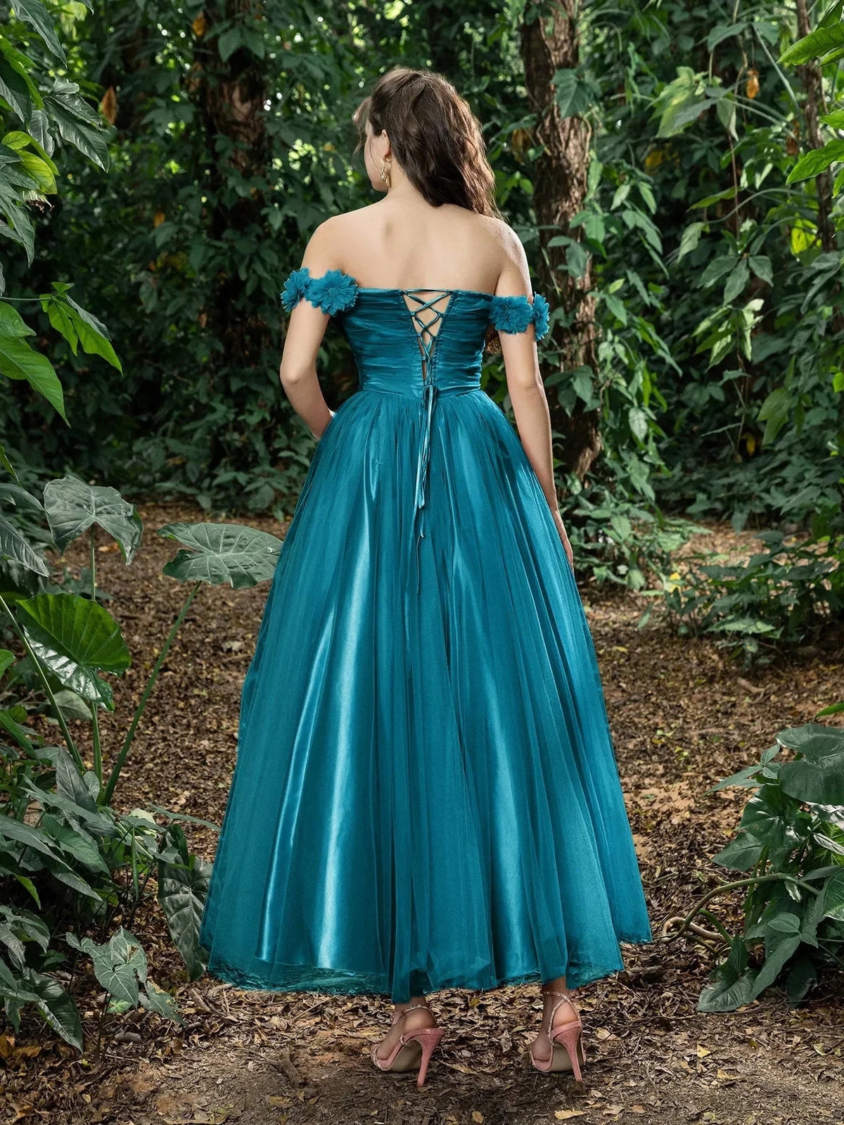 weitese's Elevate your romantic elegance with this teal tulle off-shoulder tea-length ball gown. It features soft tulle fabric with an off-shoulder neckline and floral appliqués for opulent allure, a voluminous tea-length skirt for refined charm, and a lace-up back detail for sophisticated flair. The vibrant teal hue ensures a standout finish, making it perfect for formal events, weddings, or any occasion where you want to blend vintage romance with modern grace.