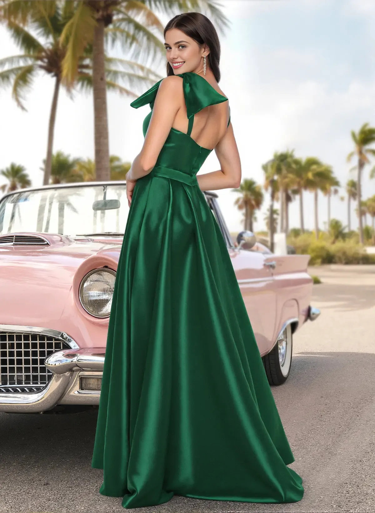 This striking emerald green gown is a vision of modern elegance, featuring a one-shoulder neckline with a dramatic satin bow detail that adds a playful, feminine touch. Crafted from premium lustrous satin with a rich emerald finish, the structured bodice cinches the waist, while a high front slit creates a bold, confident silhouette. The flowing skirt cascades to the floor, catching the light with every movement. Ideal for proms, black-tie events, or formal galas, it offers free custom color and size options to ensure a flawless, show-stopping fit on your special day.