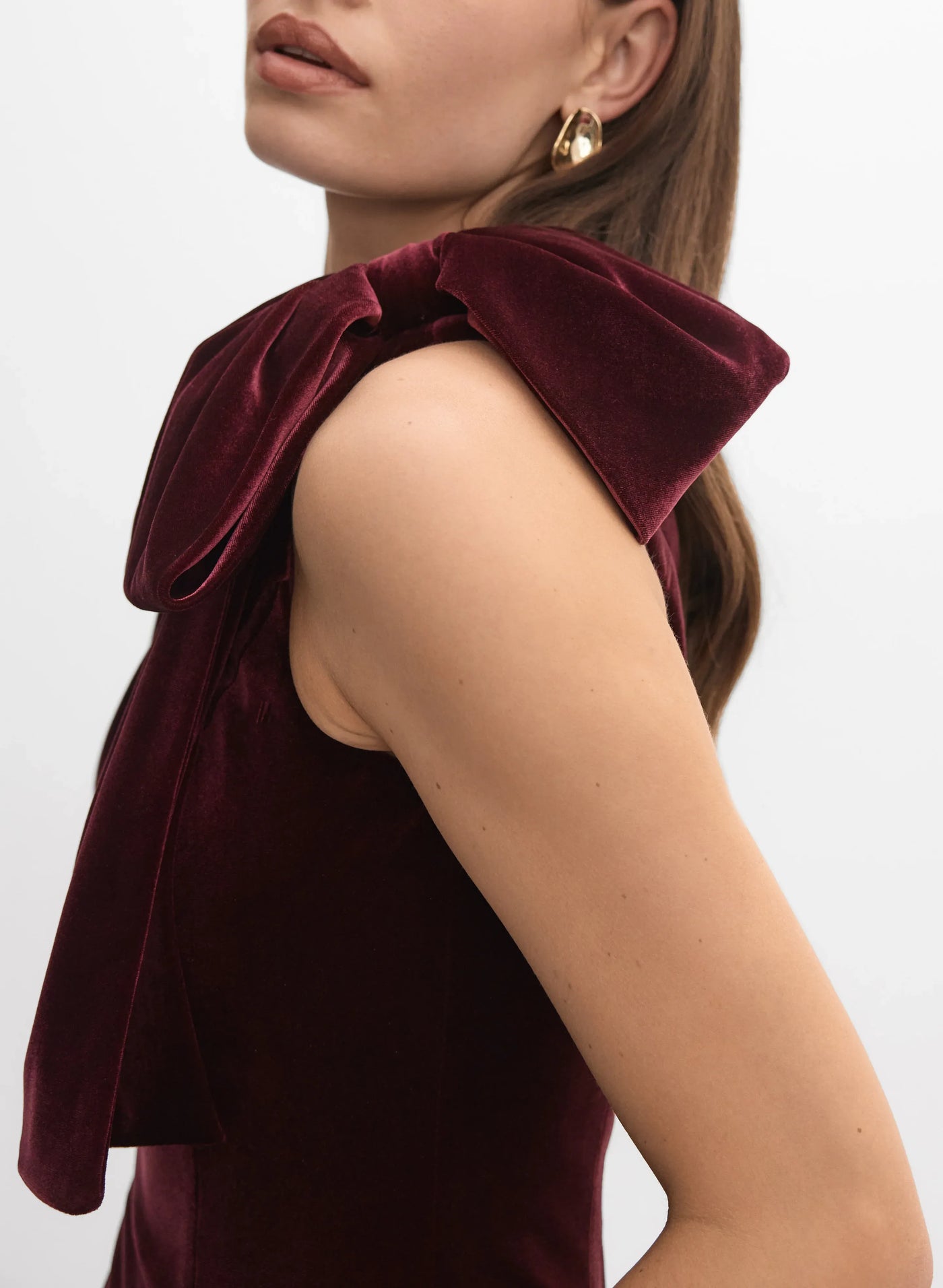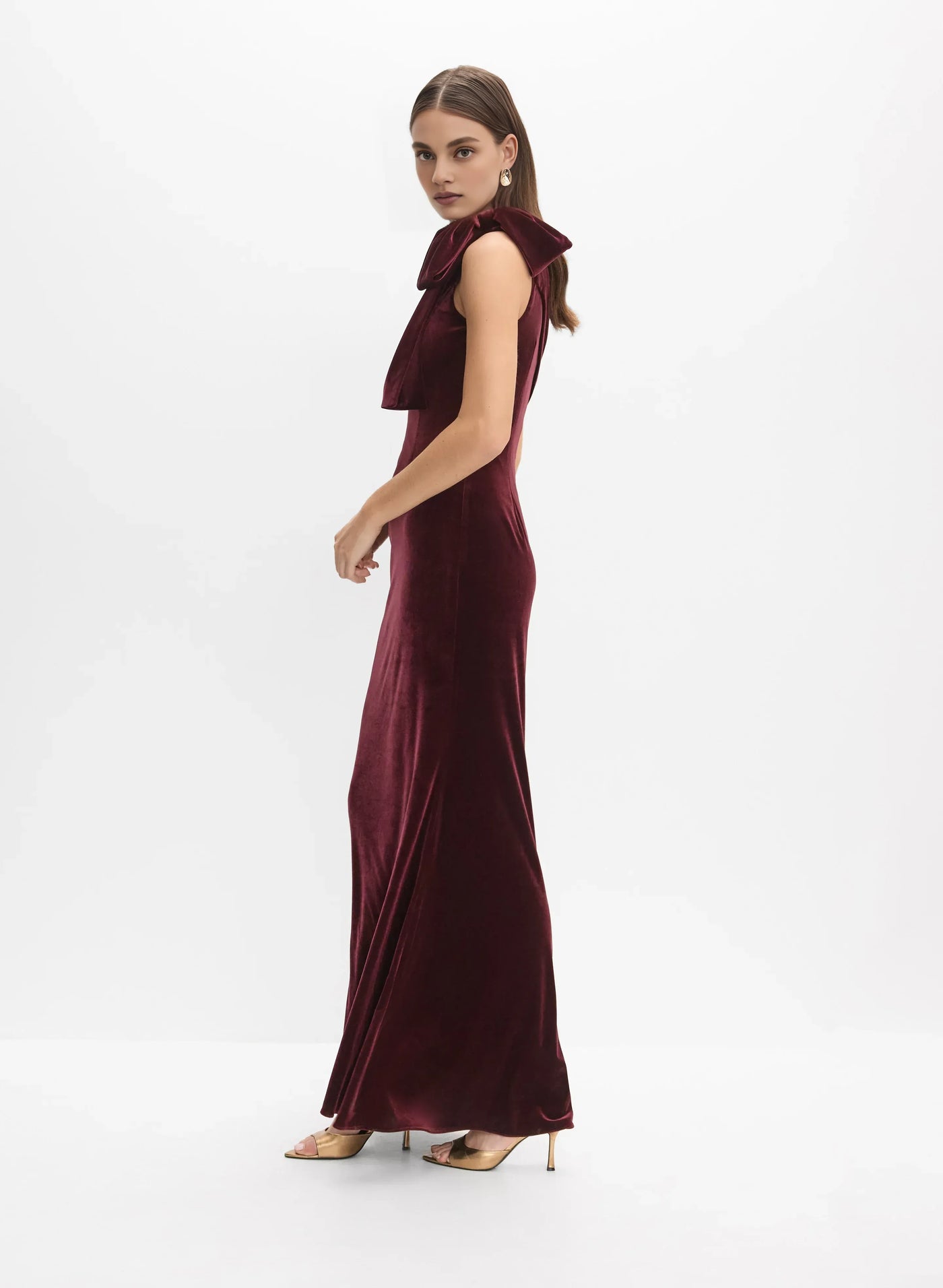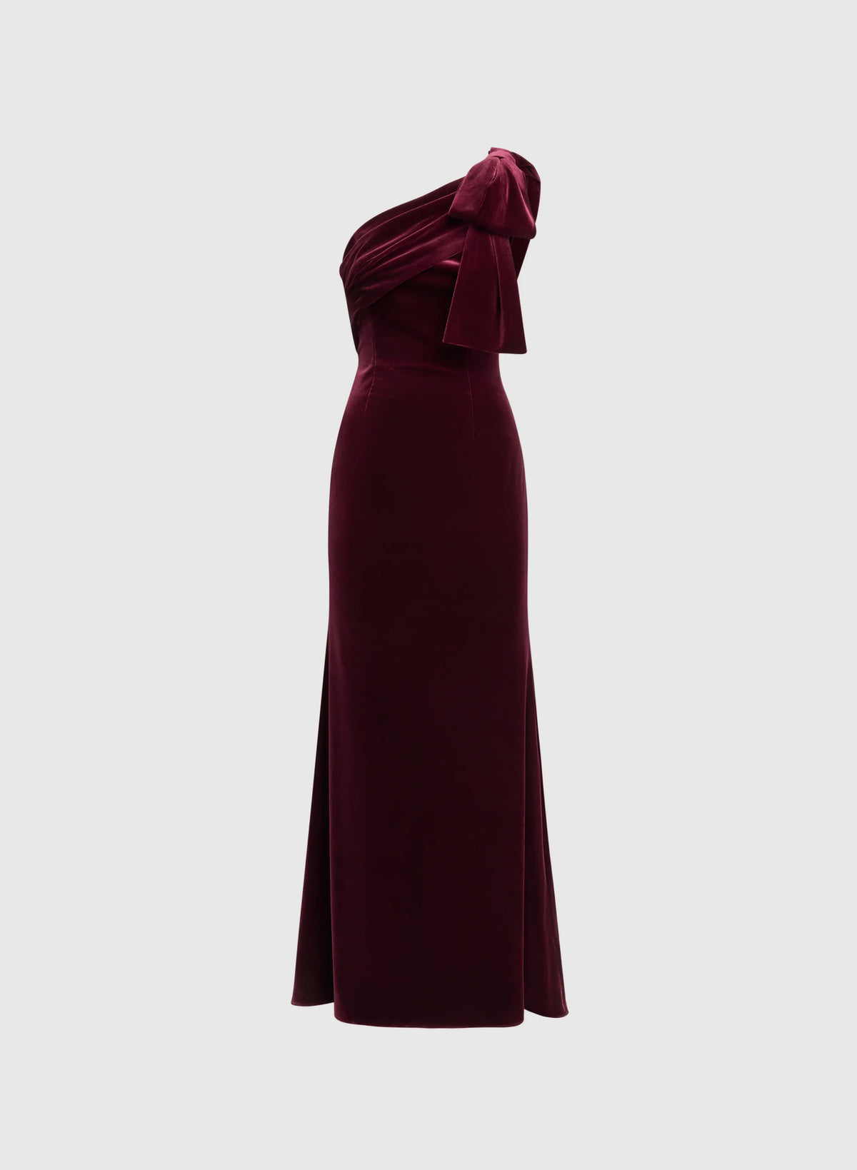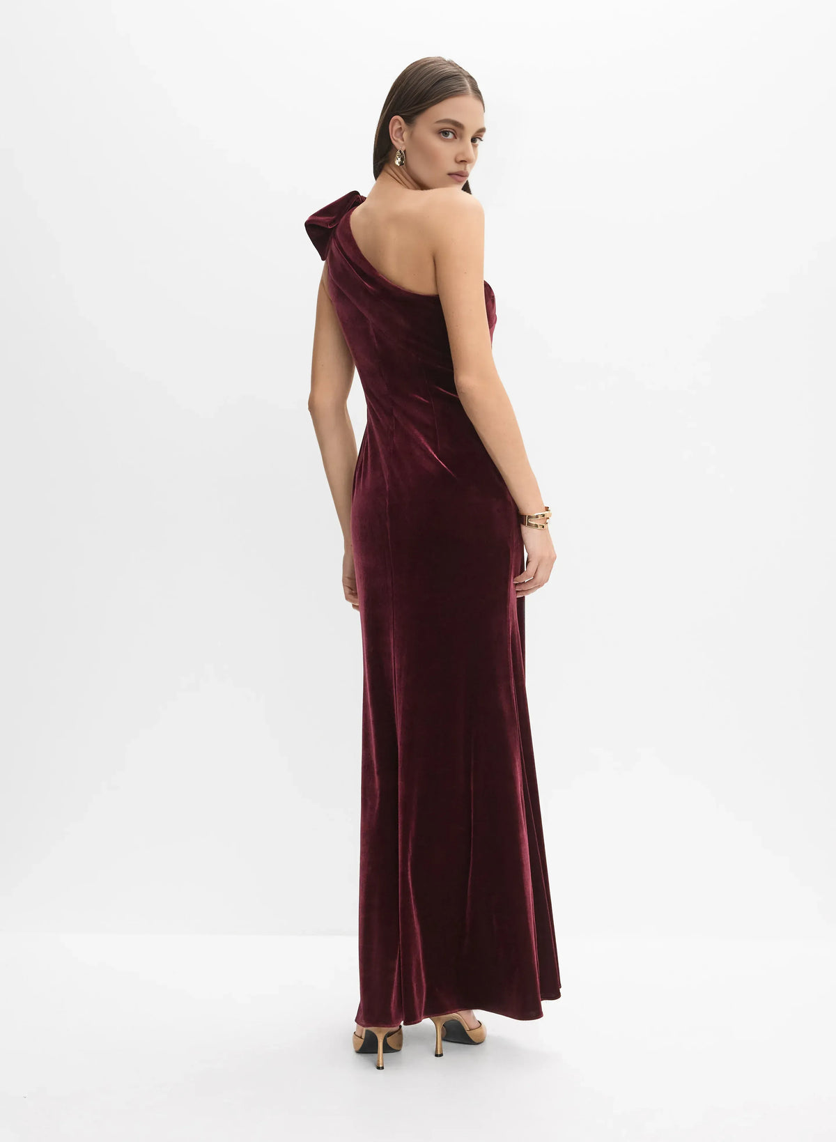 weitese's Elevate your sophisticated allure with this burgundy velvet one-shoulder gown. It features luxurious velvet fabric with a one-shoulder neckline and statement bow detail for opulent charm, a fitted silhouette and floor-length cut for refined elegance, and a sleek design that adds a touch of polished flair. The rich burgundy hue ensures a captivating finish, making it perfect for formal events, galas, or any occasion where you want to embrace timeless luxury with show-stopping style.